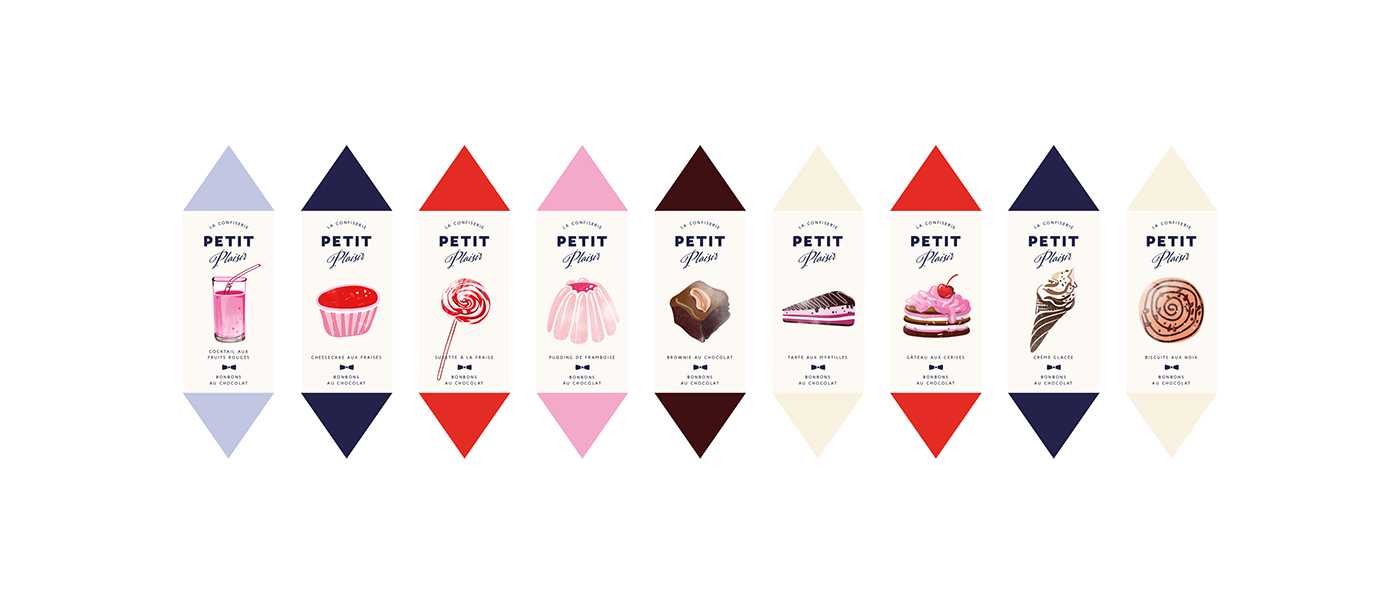 品牌由一系列巧克力呈现,有九种不同的口味:巧克力布朗尼,蓝莓派,樱桃派,坚果饼干,草莓布丁,浆果冰沙,草莓棒棒糖,冰淇淋。 糖果里面由一层纸包裹外面由礼品膜包装。 与顾客之间的沟通,以一系列与实际糖果相同的风格化图示,简单的衬里图案和不同的颜色填充来实现。