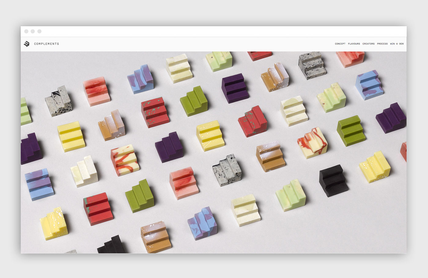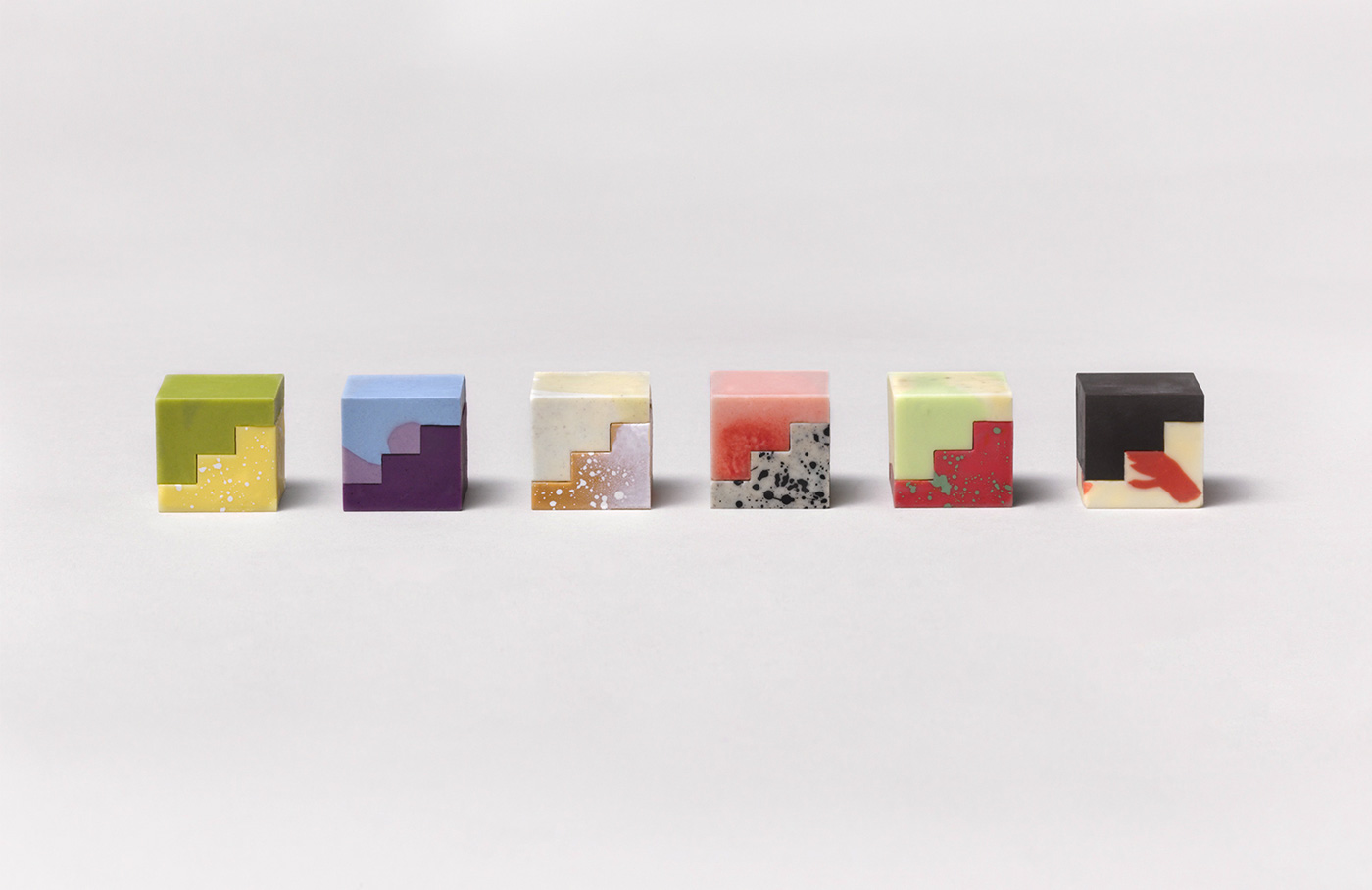 在探索了各种各样的互锁造型设计,包括最大的灵活性和优雅,我们选择了一个干净的模块化的楼梯形状的造型,结合不同的味道,创造出一个独特的立方体。在设计过程中,我们使用3D打印来创建咬合尺寸的立方体,形成完美的巧克力模具。在风味挑选中,经过多次辩论。通过广泛的品尝,选择了12种不同的的风味。